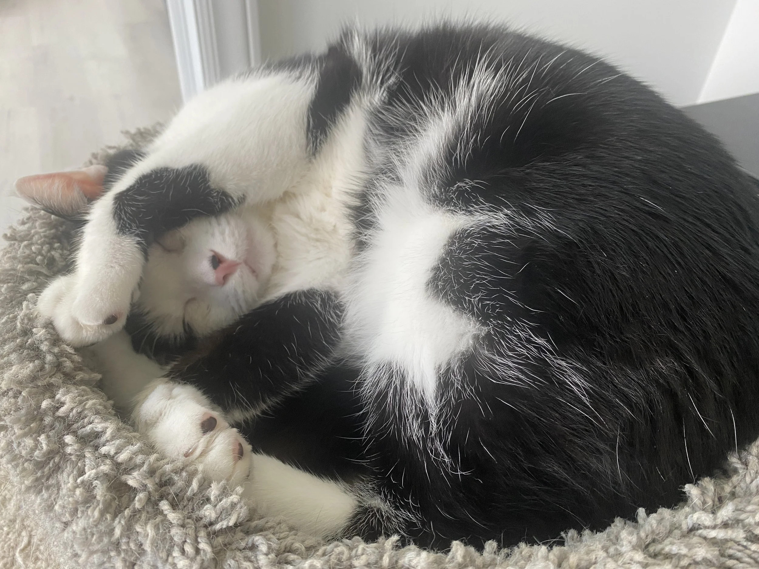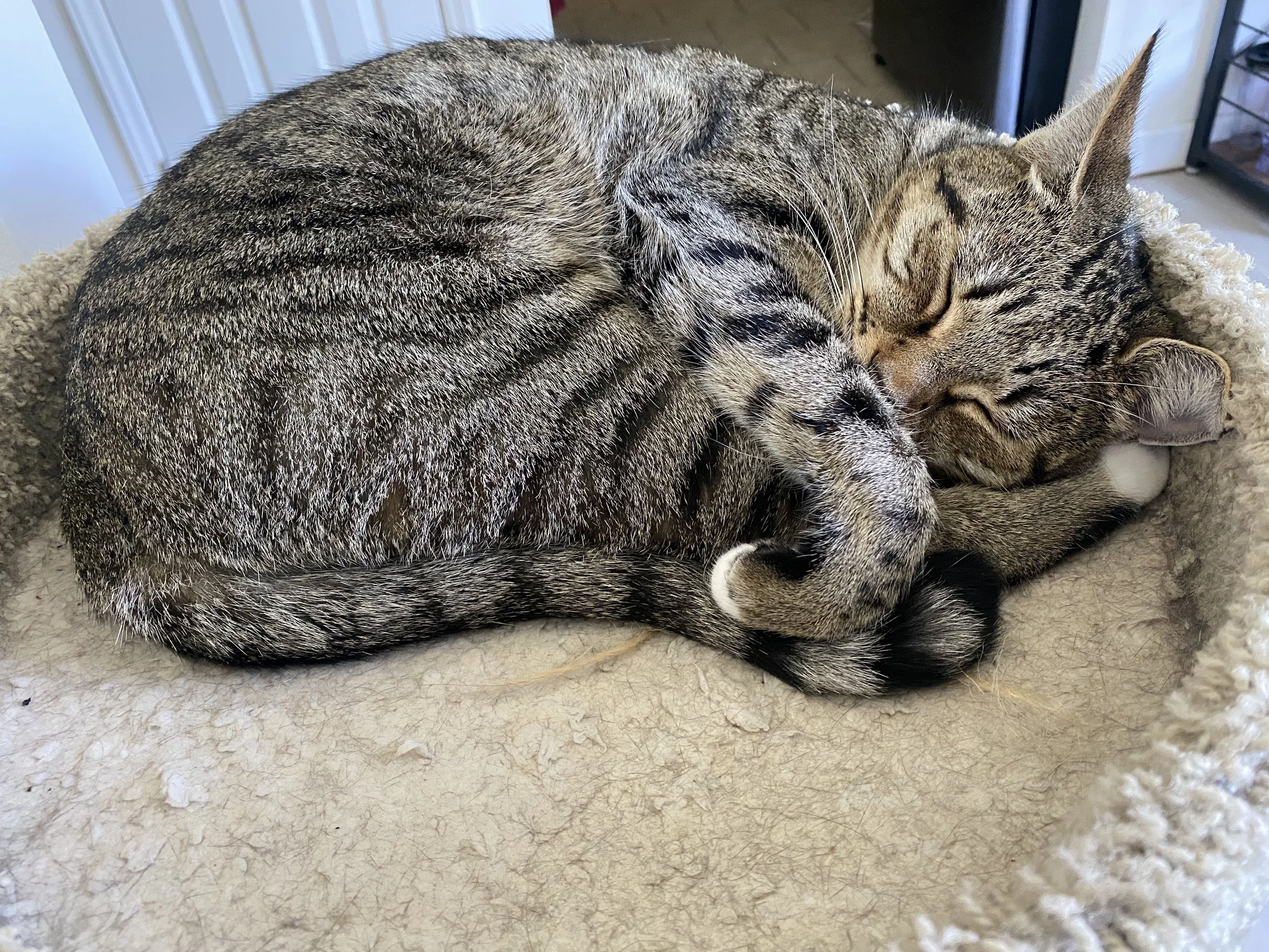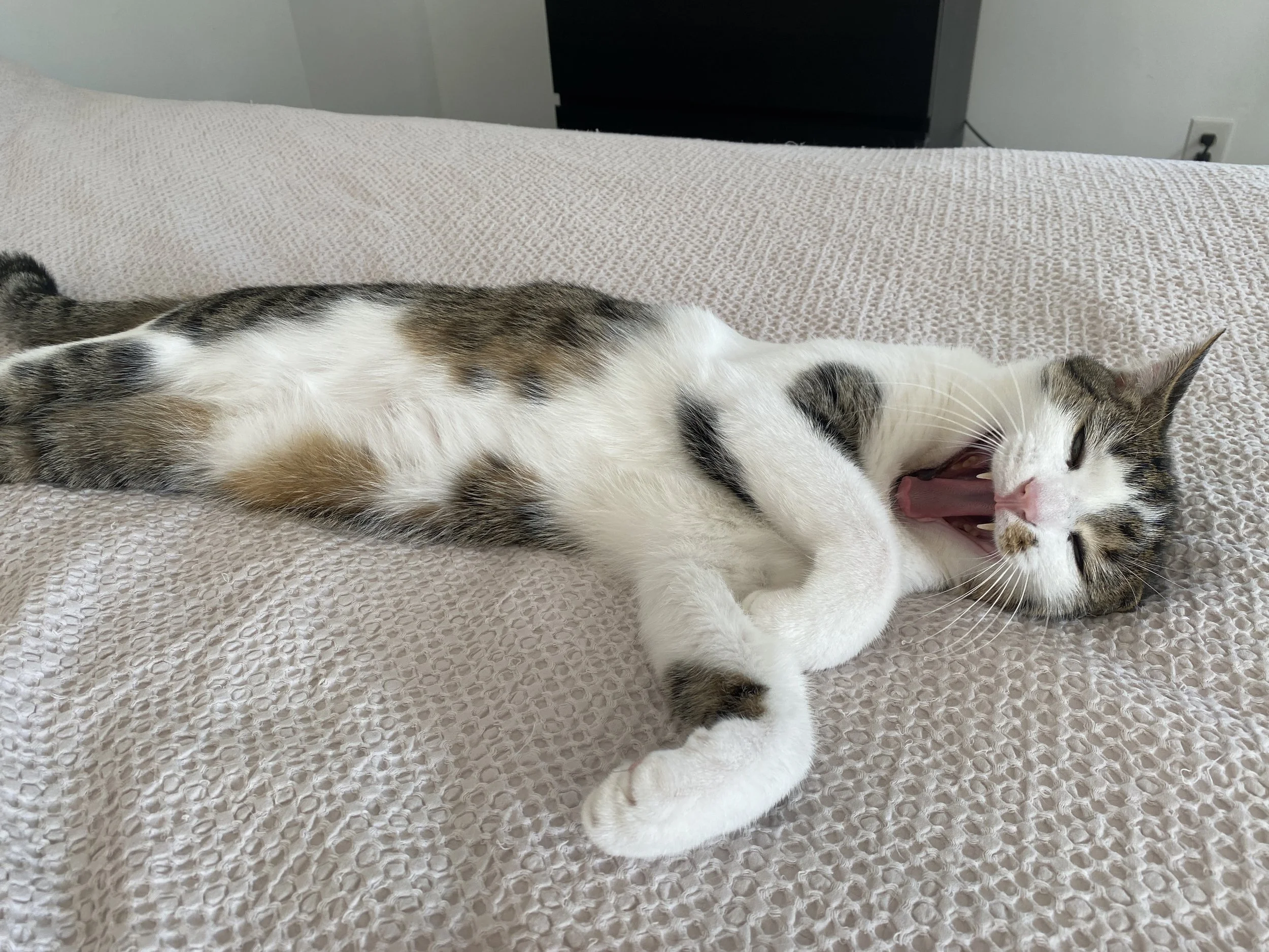 Hi, I’m Archie — the newest member of the family with a big personality. I literally walked right into our backyard, meowing loudly because I was starving. When I first arrived, I didn’t even know what toys were or how to use a cat tree, but now I absolutely love play sessions and climbing high! After a busy day of fun and mischief, my favorite thing is snuggling up close with my humans.